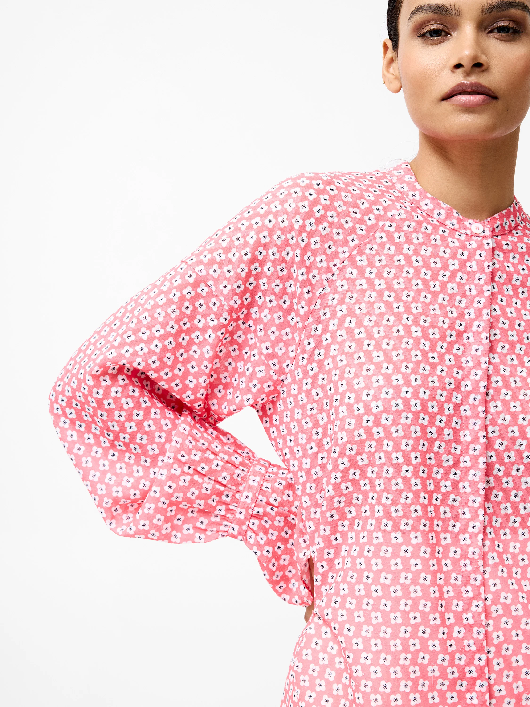 A playful take on classic tailoring. Our Abilene Fil Coupe Shirt mixes a geometric and floral pattern with subtle texture, featuring a grandad collar, flare cuffs and concealed button fastenings.