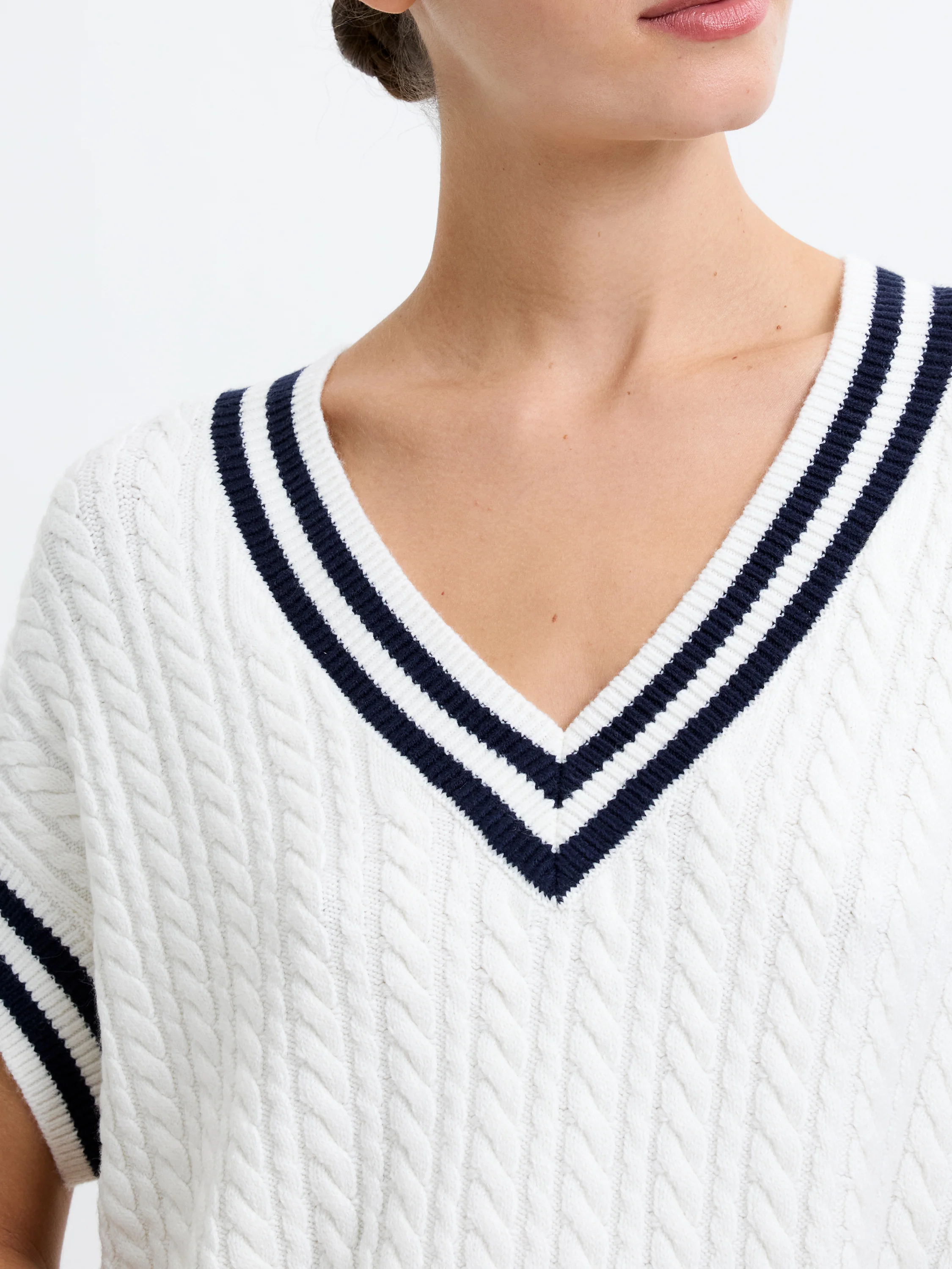 Classic with a cool edge. Our Babysoft Cable Knit V-Neck Tank Vest features a deep v-neckline, bold contrast stripes, and a cable knit finish that nods to vintage varsity style.