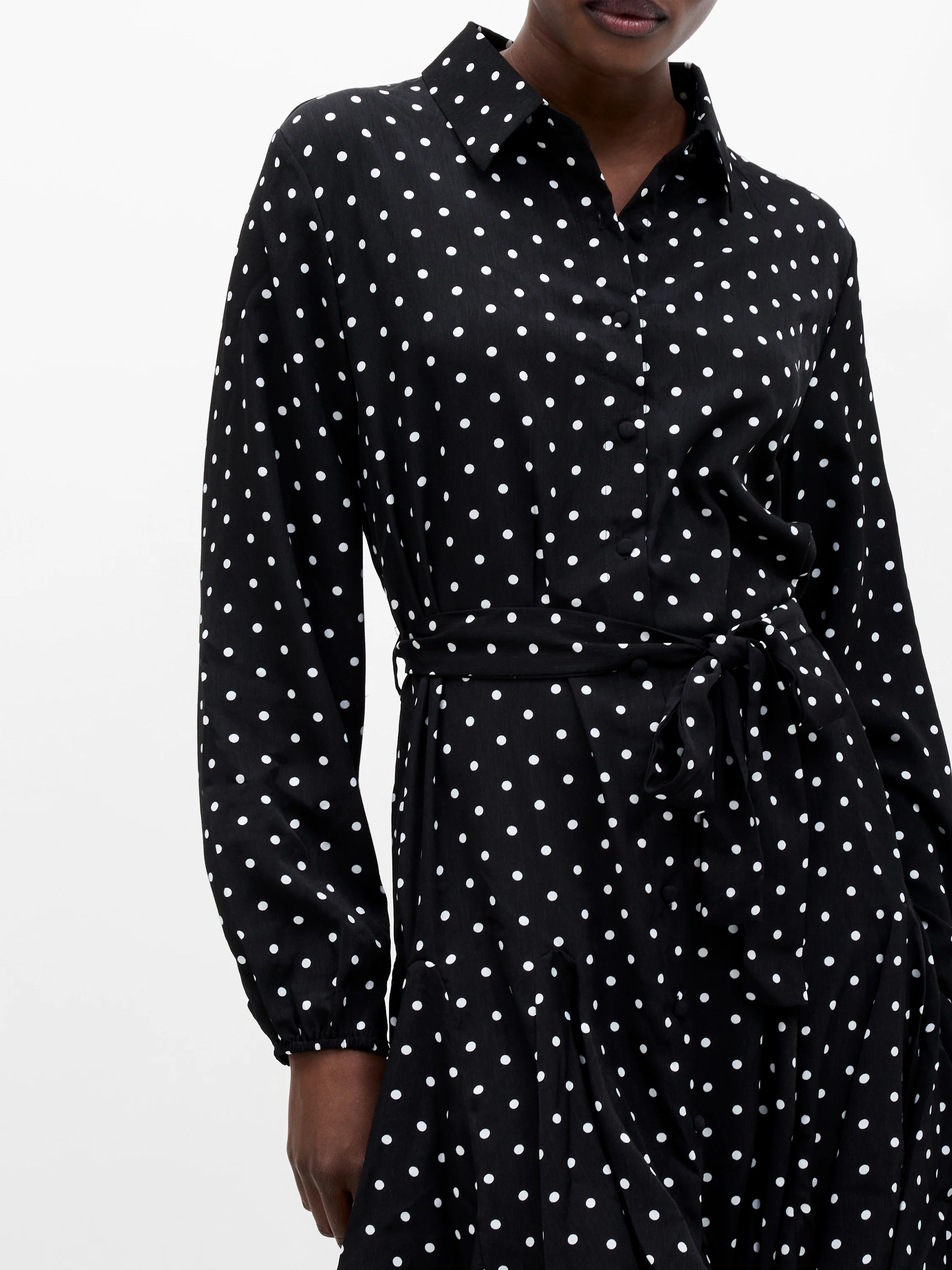 The print of the season. Our Polka Dot Swing Dress stars in monochrome polka dots, presenting a long puff sleeved silhouette complete with pointed collar, button down front, self-tie belt and flattering pleated skirt.